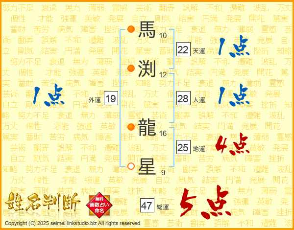 馬(10画)渕(12画) 龍(16画)星(9画)