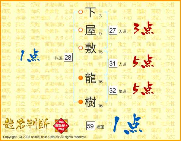 下(3画)屋(9画)敷(15画) 龍(16画)樹(16画)