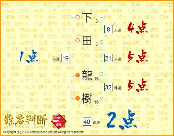 生活面を象徴する運勢です。外部から受ける影響力を表し、結婚運、家庭運や職場、環境への順応性を表します。総運から人運を引いた画数。姓や名が1文字の場合を除く。