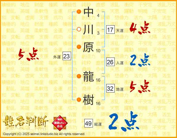 中(4画)川(3画)原(10画) 龍(16画)樹(16画)