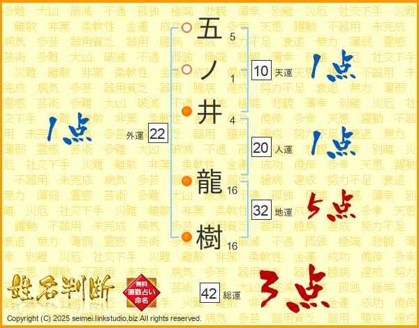 五(5画)ノ(1画)井(4画) 龍(16画)樹(16画)