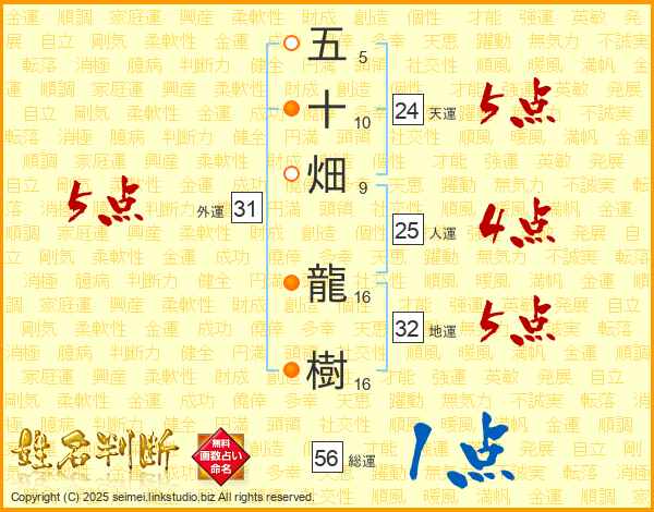 五(5画)十(10画)畑(9画) 龍(16画)樹(16画)
