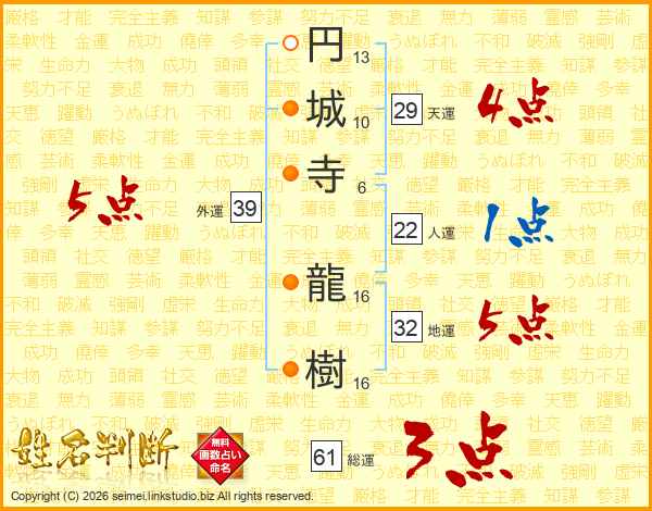 円(13画)城(10画)寺(6画) 龍(16画)樹(16画)