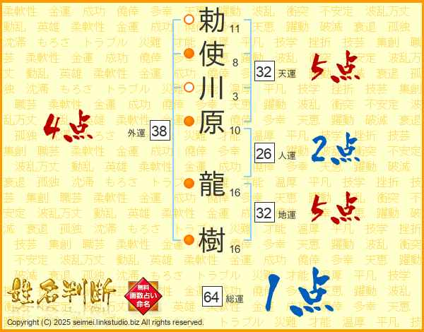 勅使川原龍樹さんの総運は64画の1点!