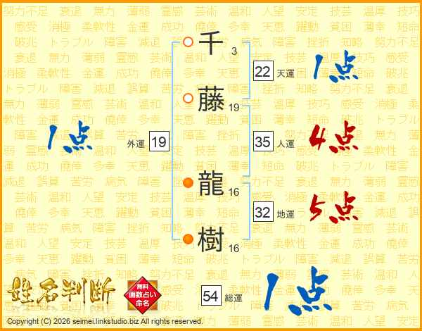 千(3画)藤(19画) 龍(16画)樹(16画)