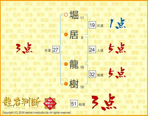 堀(11画)居(8画) 龍(16画)樹(16画)