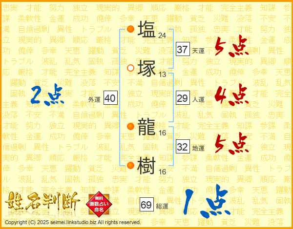 塩塚龍樹さんの総運は69画の1点!