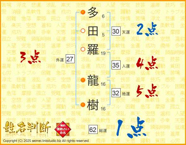 多(6画)田(5画)羅(19画) 龍(16画)樹(16画)