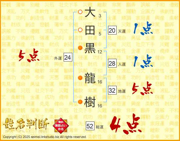大(3画)田(5画)黒(12画) 龍(16画)樹(16画)