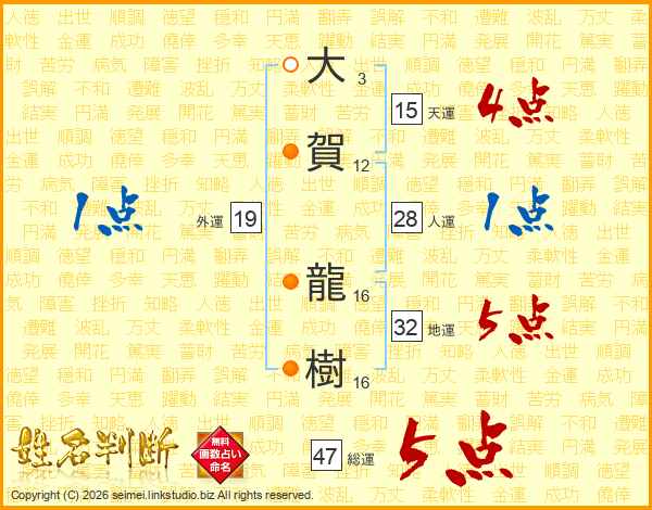 大(3画)賀(12画) 龍(16画)樹(16画)