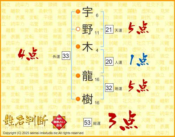 宇(6画)野(11画)木(4画) 龍(16画)樹(16画)