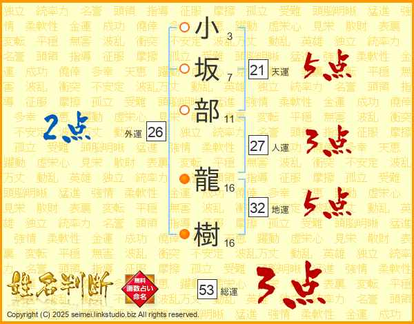 小(3画)坂(7画)部(11画) 龍(16画)樹(16画)