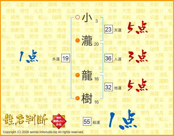 小瀧龍樹さんの天運は23画の5点!