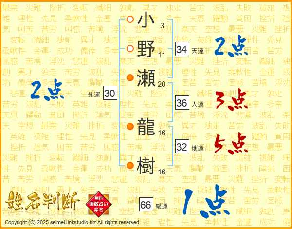 小(3画)野(11画)瀬(20画) 龍(16画)樹(16画)