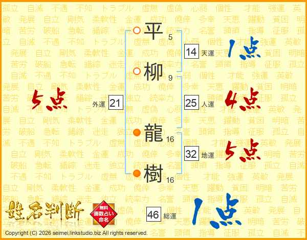 平(5画)柳(9画) 龍(16画)樹(16画)