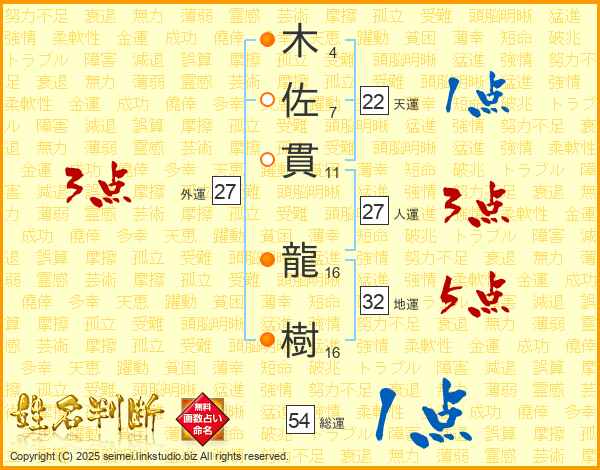 木(4画)佐(7画)貫(11画) 龍(16画)樹(16画)