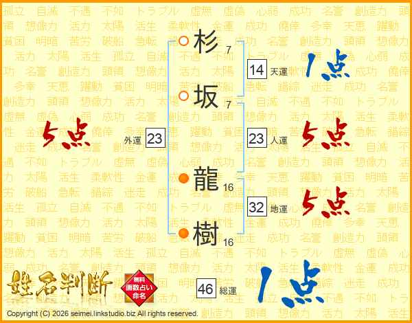 杉(7画)坂(7画) 龍(16画)樹(16画)