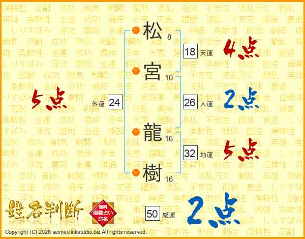 松宮龍樹さんの人運は26画の2点!