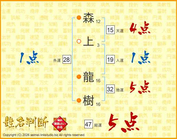 生活面を象徴する運勢です。外部から受ける影響力を表し、結婚運、家庭運や職場、環境への順応性を表します。総運から人運を引いた画数。姓や名が1文字の場合を除く。