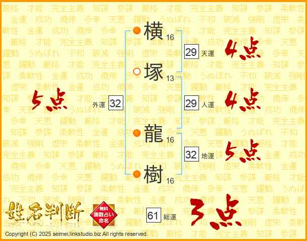 横(16画)塚(13画) 龍(16画)樹(16画)