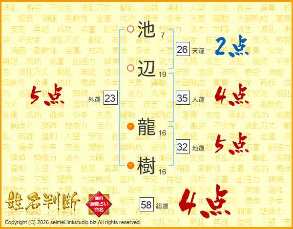 池(7画)辺(19画) 龍(16画)樹(16画)