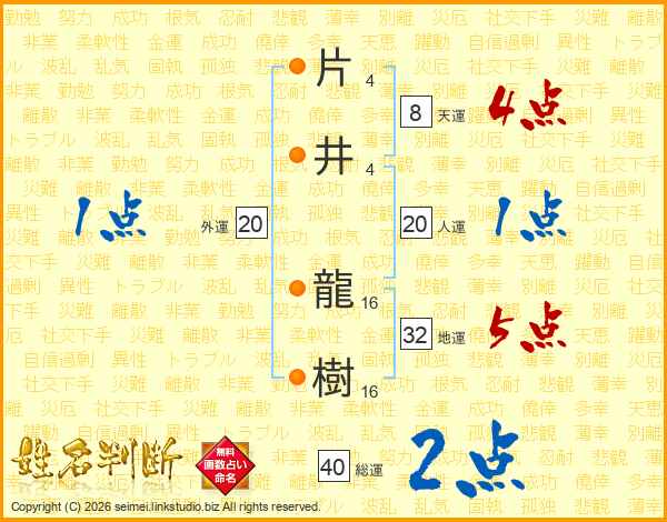 片井龍樹さんの人運は20画の1点!