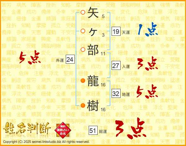 矢(5画)ヶ(3画)部(11画) 龍(16画)樹(16画)