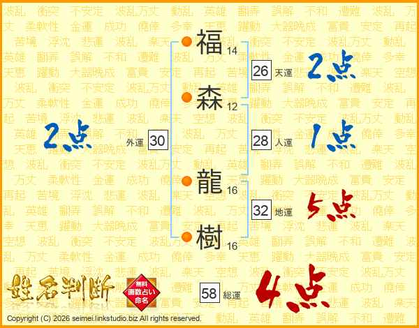 あなたの人生を表す1番重要な運勢です。生涯を通じて影響する総合運となり、主に50歳以降の晩年期に影響を及ぼします。苗字と名前の合計画数。
