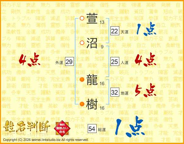 萱(13画)沼(9画) 龍(16画)樹(16画)