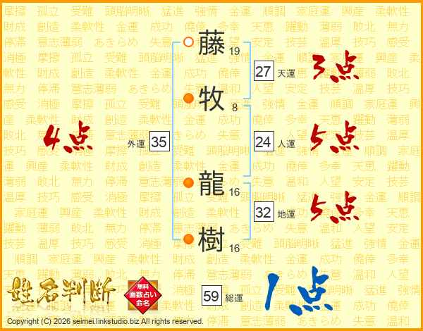 藤牧龍樹さんの天運は27画の3点!