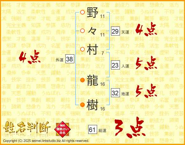 野(11画)々(11画)村(7画) 龍(16画)樹(16画)