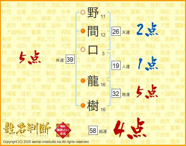 野(11画)間(12画)口(3画) 龍(16画)樹(16画)