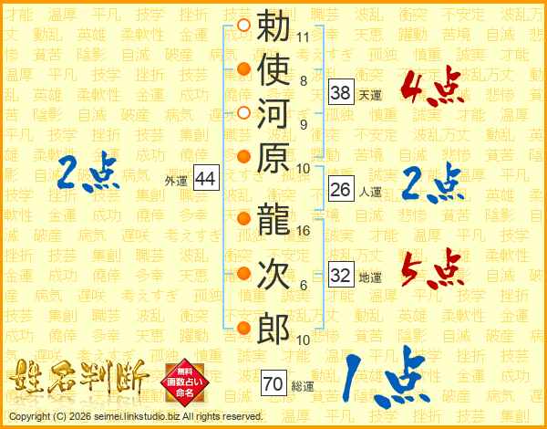 勅(11画)使(8画)河(9画)原(10画) 龍(16画)次(6画)郎(10画)