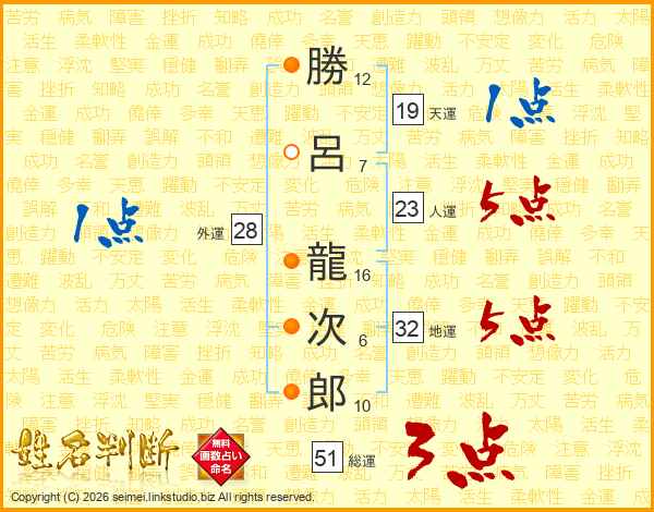 勝(12画)呂(7画) 龍(16画)次(6画)郎(10画)