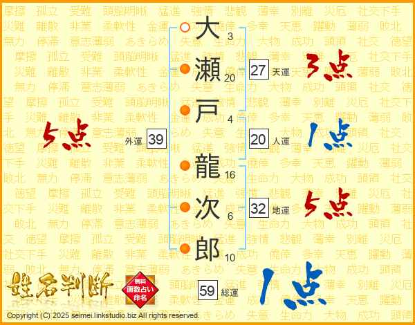 大(3画)瀬(20画)戸(4画) 龍(16画)次(6画)郎(10画)