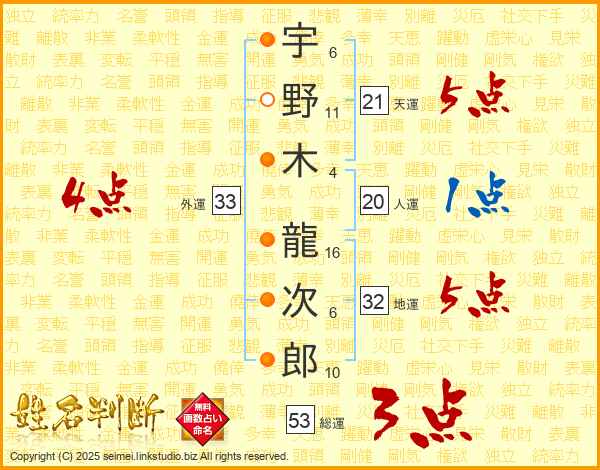 宇(6画)野(11画)木(4画) 龍(16画)次(6画)郎(10画)