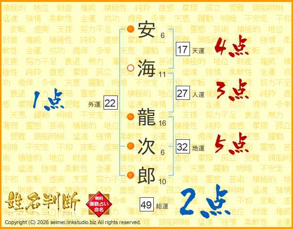 安海龍次郎さんの地運は32画の5点!