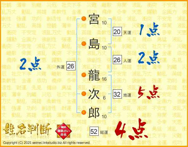 宮島龍次郎さんの総運は52画の4点!