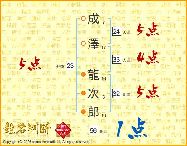 成(7画)澤(17画) 龍(16画)次(6画)郎(10画)