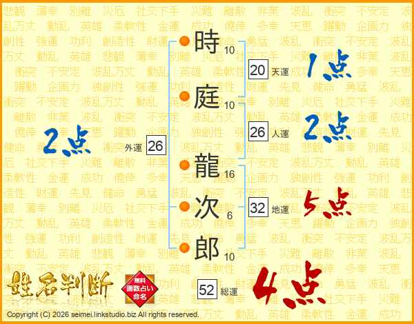 時庭龍次郎さんの総運は52画の4点!