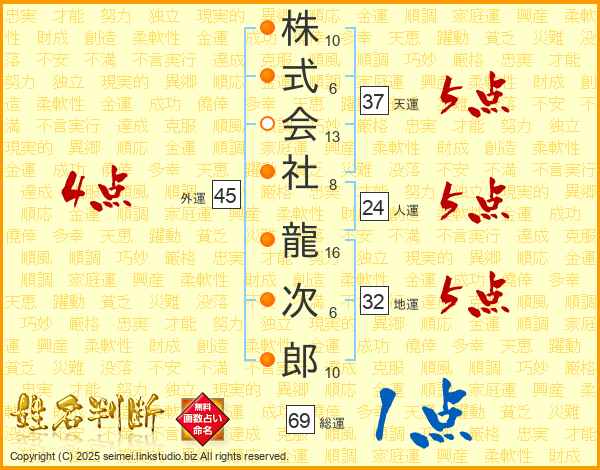 株(10画)式(6画)会(13画)社(8画) 龍(16画)次(6画)郎(10画)