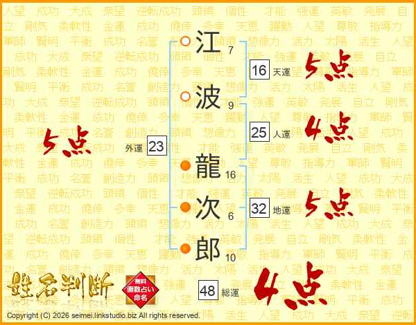 江(7画)波(9画) 龍(16画)次(6画)郎(10画)