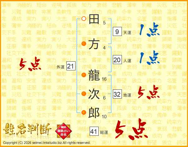 田(5画)方(4画) 龍(16画)次(6画)郎(10画)