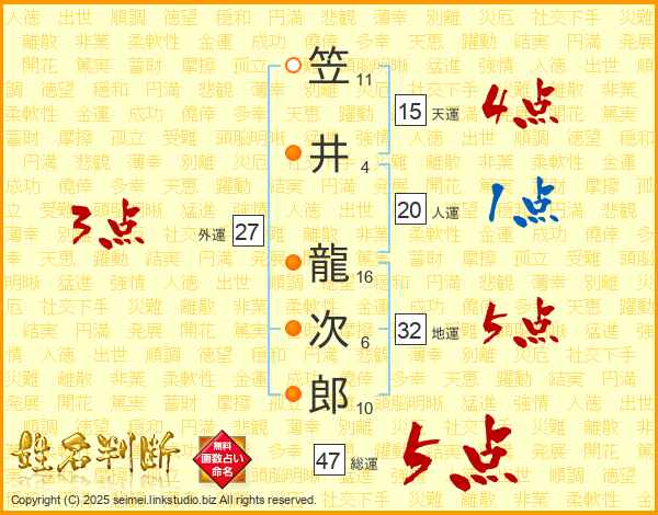 笠井龍次郎さんの総運は47画の5点!