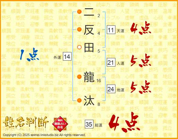 二(2画)反(4画)田(5画) 龍(16画)汰(8画)