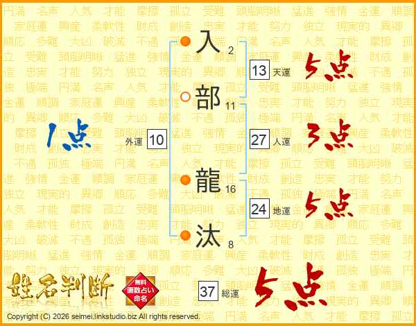 生活面を象徴する運勢です。外部から受ける影響力を表し、結婚運、家庭運や職場、環境への順応性を表します。総運から人運を引いた画数。姓や名が1文字の場合を除く。