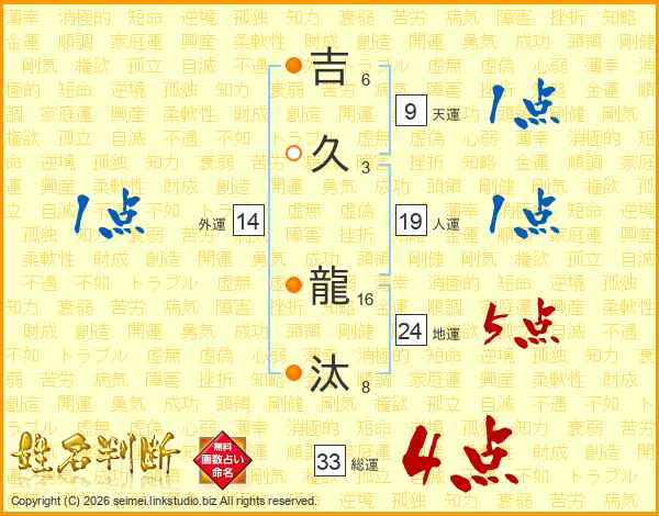 吉(6画)久(3画) 龍(16画)汰(8画)