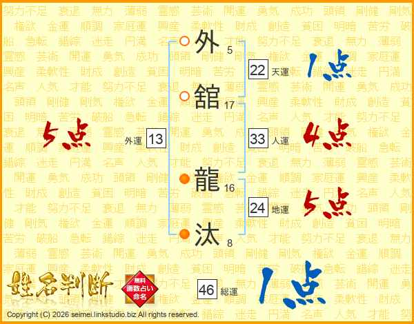 外(5画)舘(17画) 龍(16画)汰(8画)