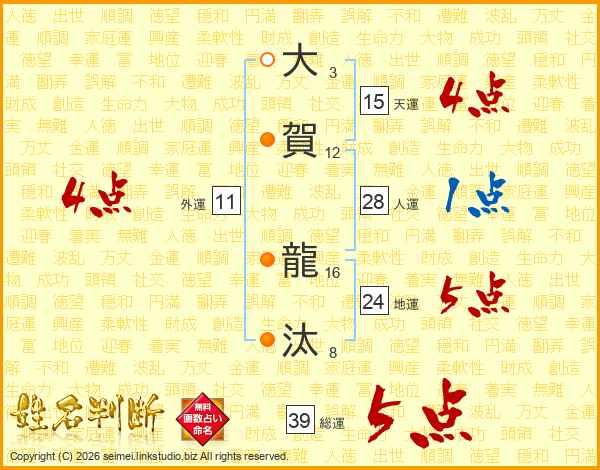 大(3画)賀(12画) 龍(16画)汰(8画)