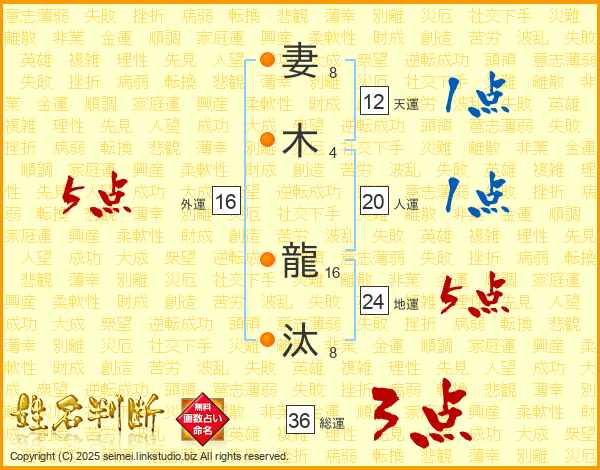 妻(8画)木(4画) 龍(16画)汰(8画)